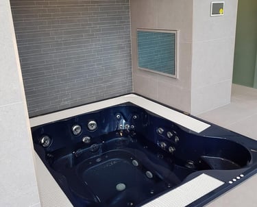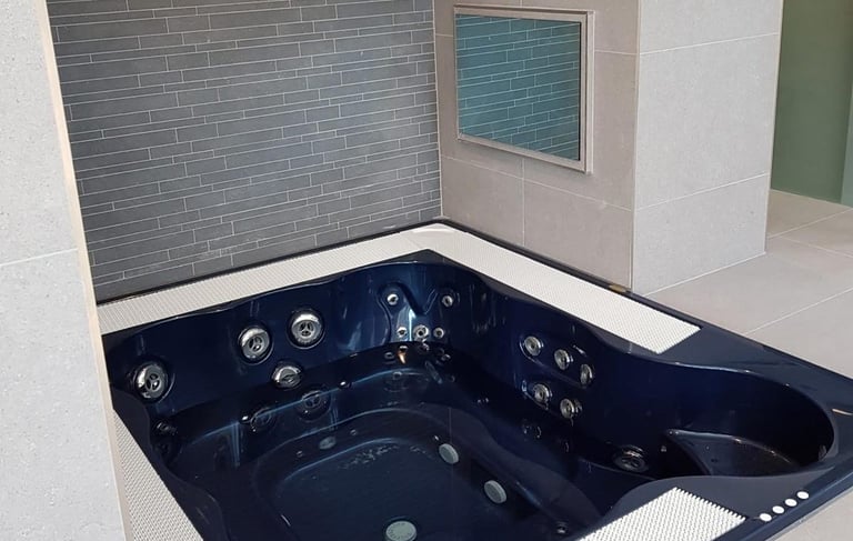 This impressive sunken jacuzzi installation provides a luxurious spa experience within the home. The deep blue acrylic shell features multiple strategically positioned massage jets for targeted hydrotherapy, surrounded by contemporary grey metro and large-format tiling with contrasting mosaic detailing.