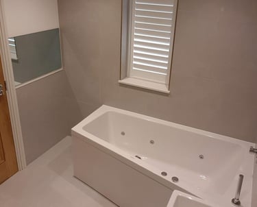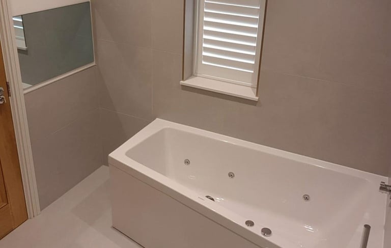This sophisticated bathroom installation features a built-in whirlpool bath with multiple massage jets, providing a spa-like experience at home. The clean white finish and streamlined design create a calm, relaxing environment.