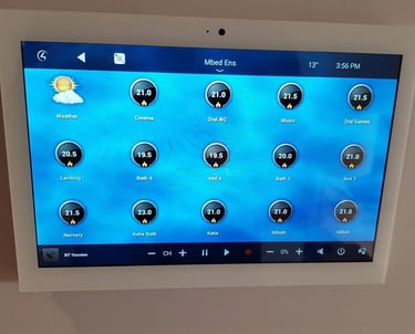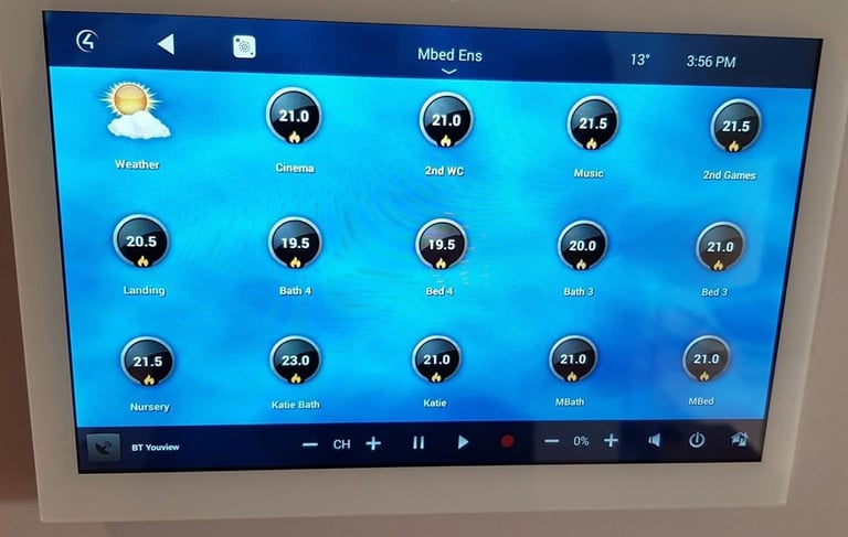 This installation at Middlehill Road features an advanced smart home heating system integrating KNX and Control4 technology. The intuitive touchscreen interface provides complete control and monitoring of the entire property's climate systems from any room.