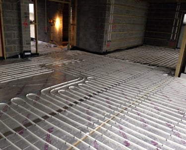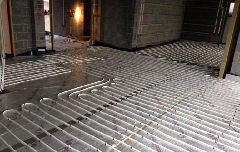 This image showcases the precision and care that Wessex Services Group brings to every installation. The underfloor heating pipework has been methodically laid across all three floors of this coastal property, demonstrating the level of craftsmanship our team applies even to work that will be concealed beneath the screed.