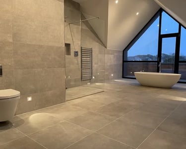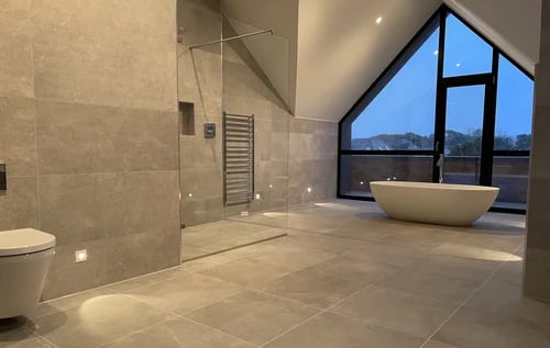 This spacious master ensuite features a contemporary freestanding bath positioned beside full-height glazing, a walk-in wetroom shower and large-format porcelain tiles throughout. The room is heated via a full underfloor heating system and complemented by a sleek heated towel rail, creating a warm, luxurious and modern bathing space.