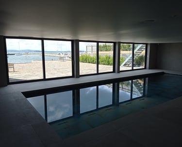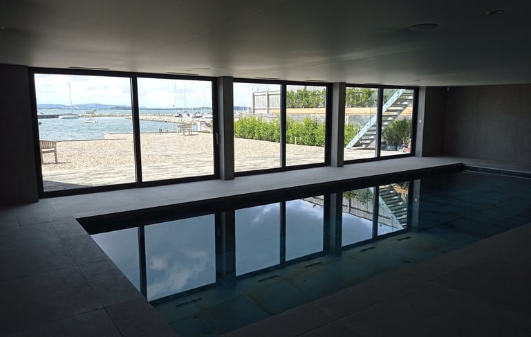 The swimming pool is located on the basement level of this property providing panoramic sea views from the triple bay sliding glass doors.