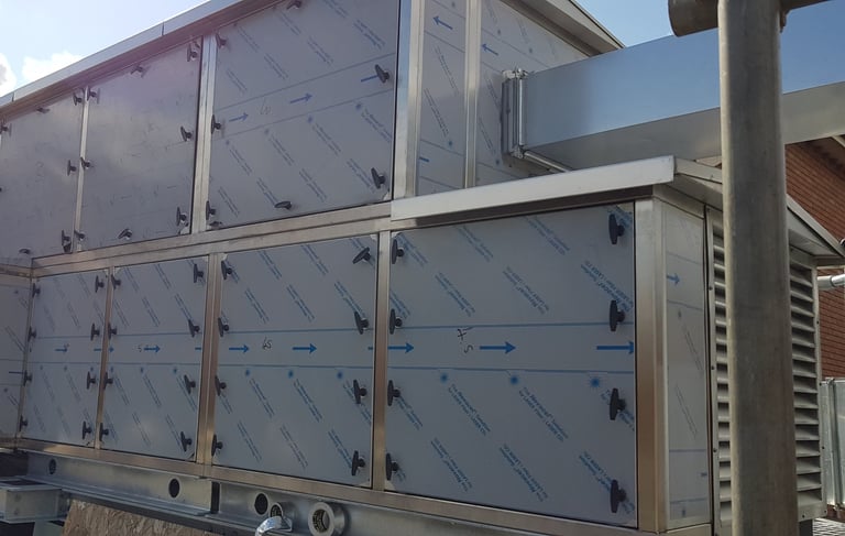 Wessex Services Group designed and installed a bespoke heat recovery ventilation system for this luxury property in Poole. To accommodate the tight ceiling voids, WSG manufactured slimline rectangular ductwork in-house, ensuring a precise fit without compromising performance. A large external louvre was also custom-made, powder-coated, and installed to match the building’s façade, delivering both functionality and a seamless architectural finish.