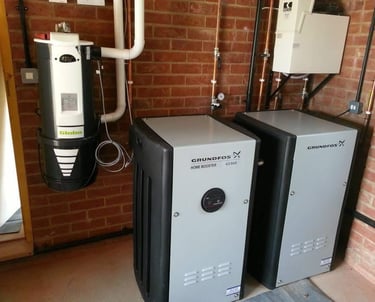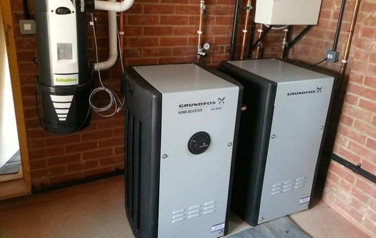 This plant room installation at the Seahorses development features a Grundfos Home Booster unit paired with a break tank, designed to maintain consistent water pressure throughout the property even when multiple taps, showers, or appliances are in use simultaneously.
