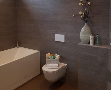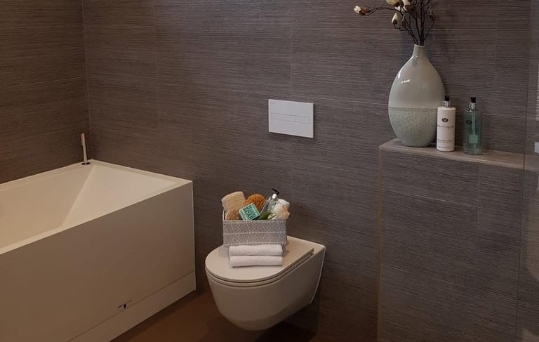 The installation features a wall-hung WC and floating vanity unit, both contributing to the streamlined look whilst making the space feel more open. A stone resin bath (weighing 120kg and requiring four people to manoeuvre into position) adds a luxurious centrepiece to the room.