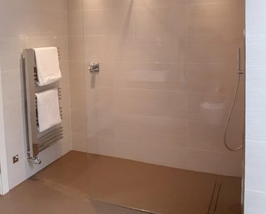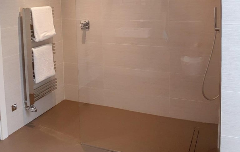 This wet room installation demonstrates the practical benefits of using a continuous resin floor system. Unlike traditional tiled wet room floors, the seamless resin surface eliminates grout lines, creating a sleek, modern appearance whilst simplifying cleaning and maintenance.