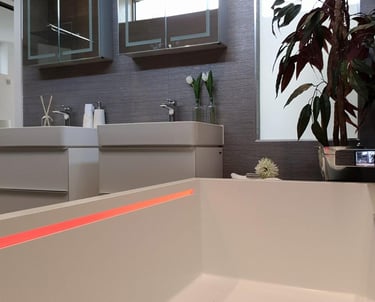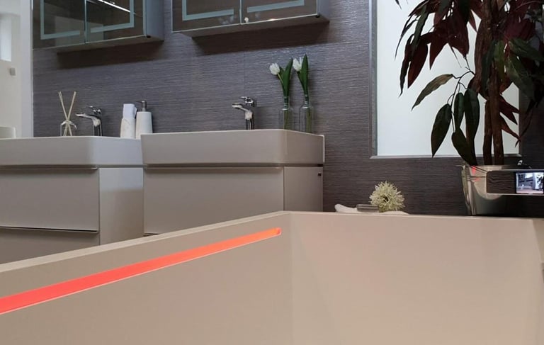This sophisticated bathroom installation showcases modern design details and quality fixtures. The stone resin bath features an integrated LED strip within the overflow, creating ambient lighting that enhances the contemporary aesthetic whilst serving a practical purpose.